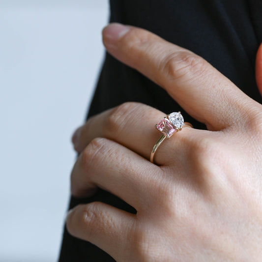 Solid Gold Toi et Moi Emerald Cut Pink Lab Grown Sapphire & Pear Cut Moissanite Engagement Ring
