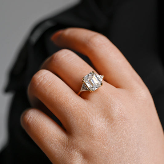 Solid Gold Trillion Accents Emerald Cut Moissanite Engagement Ring