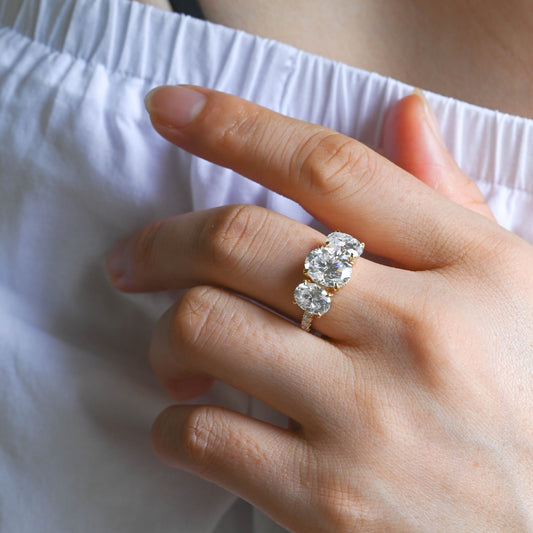 Solid Gold Hidden Halo Three Stone Oval Cut Moissanite Engagement Ring