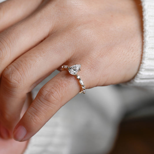 Solid Gold Pear Cut Moissanite Engagement Ring With Marquise Cut Accent