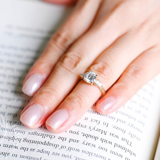 Solid Gold Three Stone Round Cut Moissanite Engagement Ring with Tapered Accent Stone