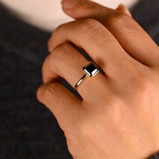 Solid Gold Bezel Black Asscher Moissanite Engagement Ring