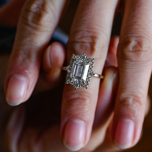 Solid Gold Vintage Style Halo Emerald Cut Moissanite Engagement Ring