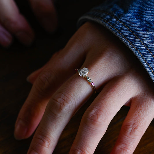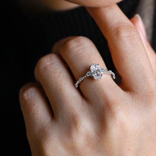 Solid Gold Oval Cut Moissanite Engagement Ring with Aquamarine & Ruby Side Stones