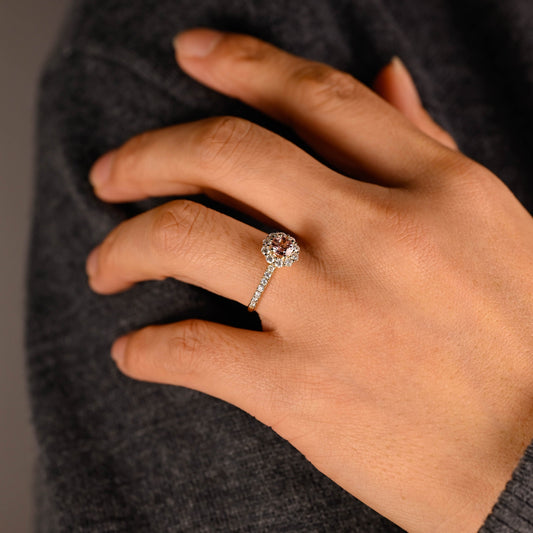 Solid Gold Floral Halo Lab Grown Pink Sapphire Engagement Ring