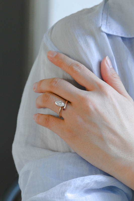 Solid Gold Open Shank Marquise Cut Moissanite Engagement Ring with Ruby Stone