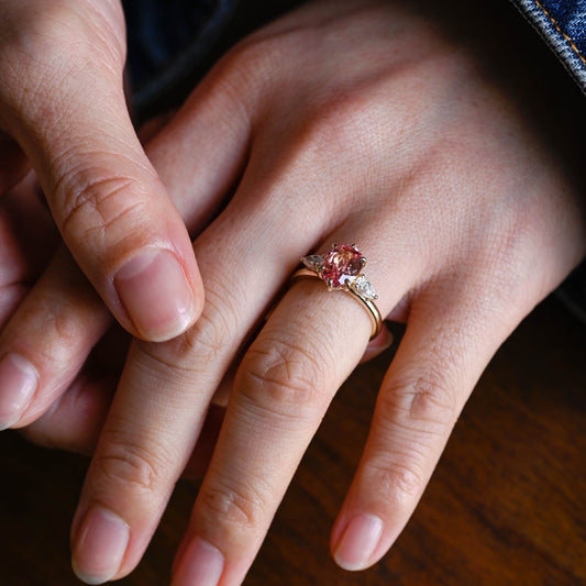 Solid Gold Three Stone Oval Cut Pink Moissanite Engagement Ring