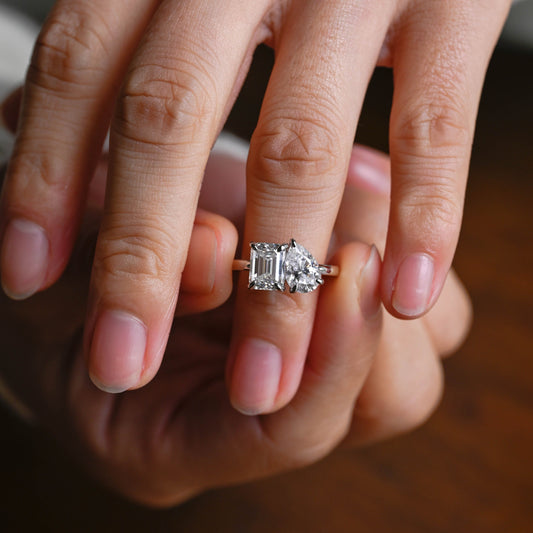 Solid Gold Toi et Moi Emerald Cut & Pear Cut Moissanite Engagement Ring