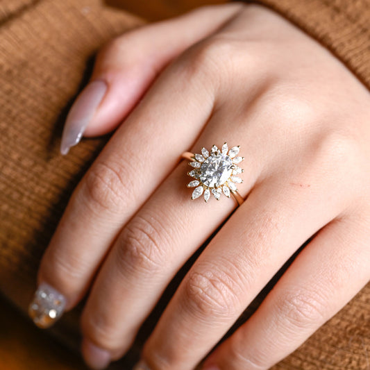 Solid Gold Starburst Halo Oval Moissanite Engagement Ring