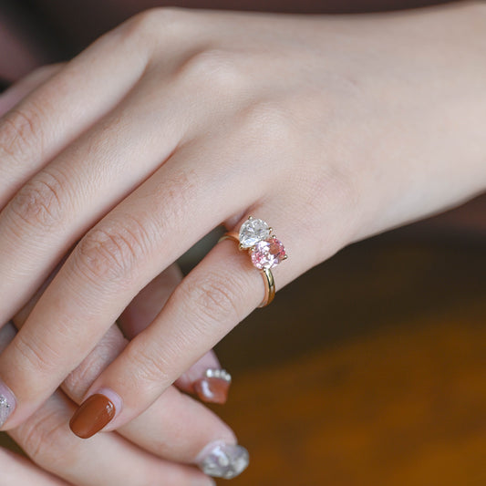 Solid Gold Toi et Moi Oval Lab Grown Pink Sapphire & Pear Moissanite Engagement Ring