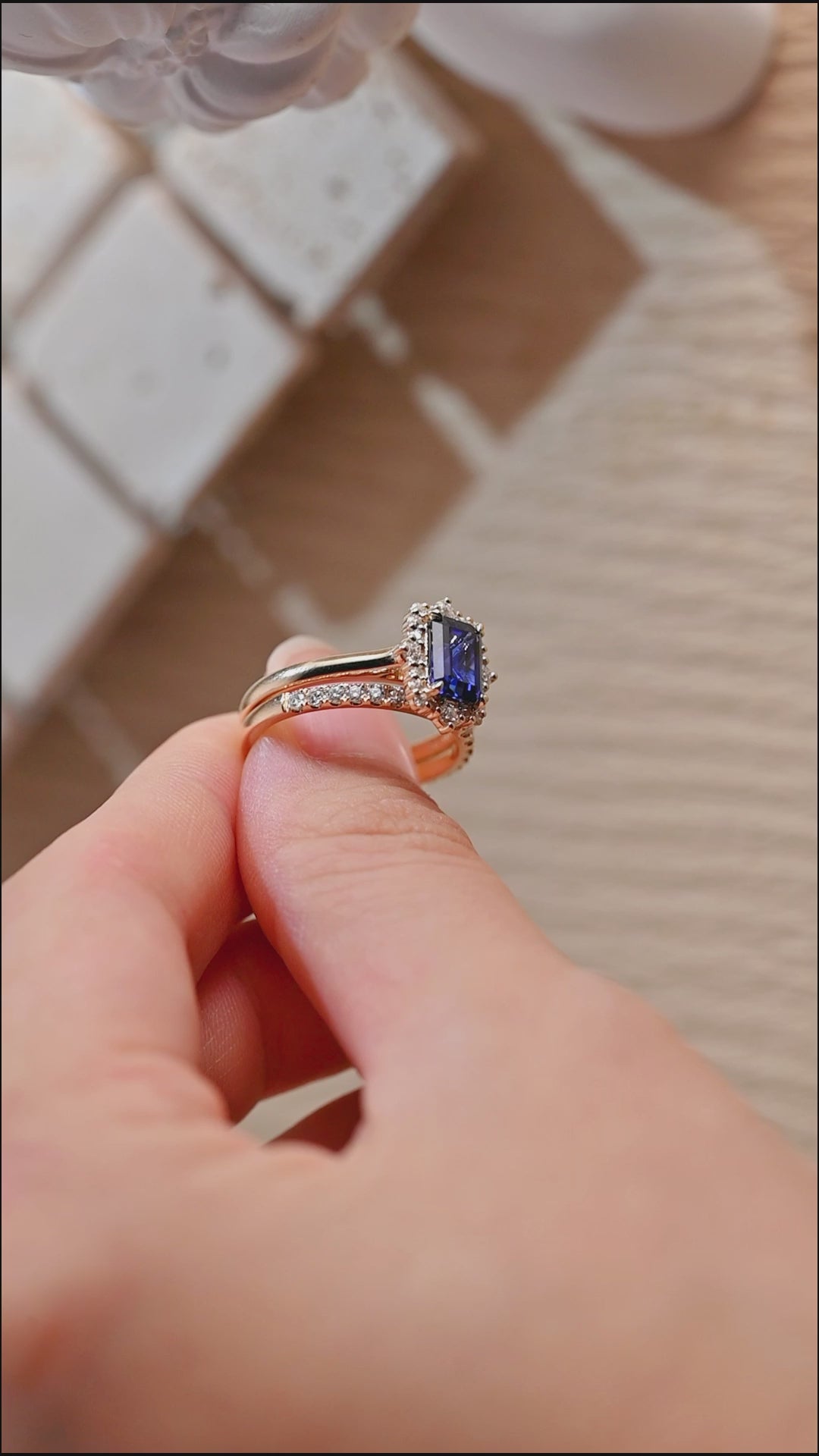 Solid Gold Halo Emerald Cut Blue Lab Grown Sapphire Ring Set